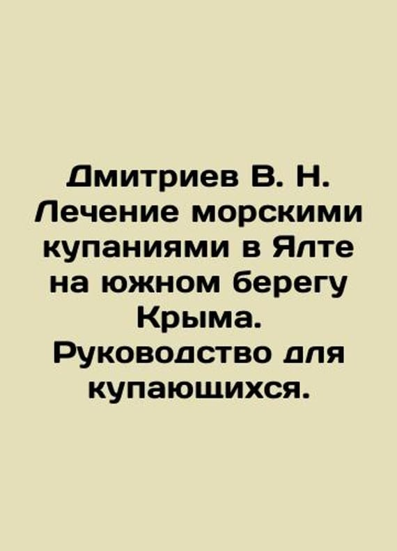 Dmitriev V. N. Sea bathing treatment in Yalta on the southern coast of Crimea. Bathing guide. In Russian /Dmitriev V. N. Lechenie morskimi kupaniyami v Yalte na yuzhnom beregu Kryma. Rukovodstvo dlya kupayushchikhsya. Moscow Publishing House V. Sekachev 2021. 216s. We have thousands of titles and often several copies of each title may be available. Please feel free to contact us for a detailed description of the copies available. SKUalb1697d5f22f258c2a.