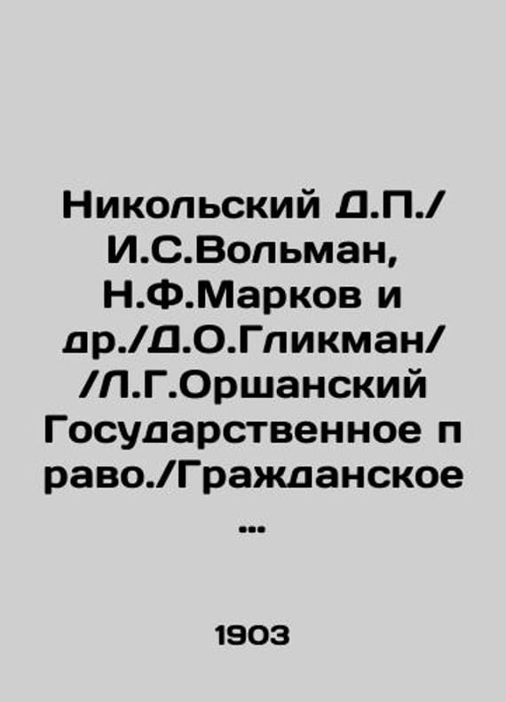 Nikolsky D.P. / I.S.Volman N.F.Markov et al. / D.O.Glickman / / L.G.Orsha State Law. / Civil Law. / Criminal Statute. / State Law. / Criminal Anthropology and Forensics. Convolute. In Russian (ask us if in doubt)/Nikolskiy D.P./ I.S.Volman N.F.Markov i dr./D.O.Glikman/ /L.G.Orshanskiy Gosudarstvennoe pravo./Grazhdanskoe pravo./Ugolovnoe ulozhenie./Gosudarstvennoe pravo./Kriminalnaya antropologiya i sudebnaya meditsina. Konvolyut. S.Pb.1903 79 232 39 144 47 p. We have thousands of titles and often several copies of each title may be available. Please feel free to contact us for a detailed description of the copies available. SKUalb171063984eb9cba3