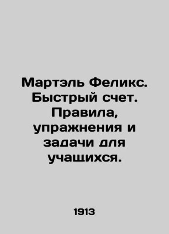Martel Felix. Quick Counting. Rules, Exercises, and Tasks for Students. In Russian /Martel Feliks. Bystryy schet. Pravila, uprazhneniya i zadachi dlya uchashchikhsya. Quick Counting. Rules, Exercises and Tasks for Students. St. Petersburg Synodal Printing House 1913. We have thousands of titles and often several copies of each title may be available. Please feel free to contact us for a detailed description of the copies available. SKUalb182ec288360da132.