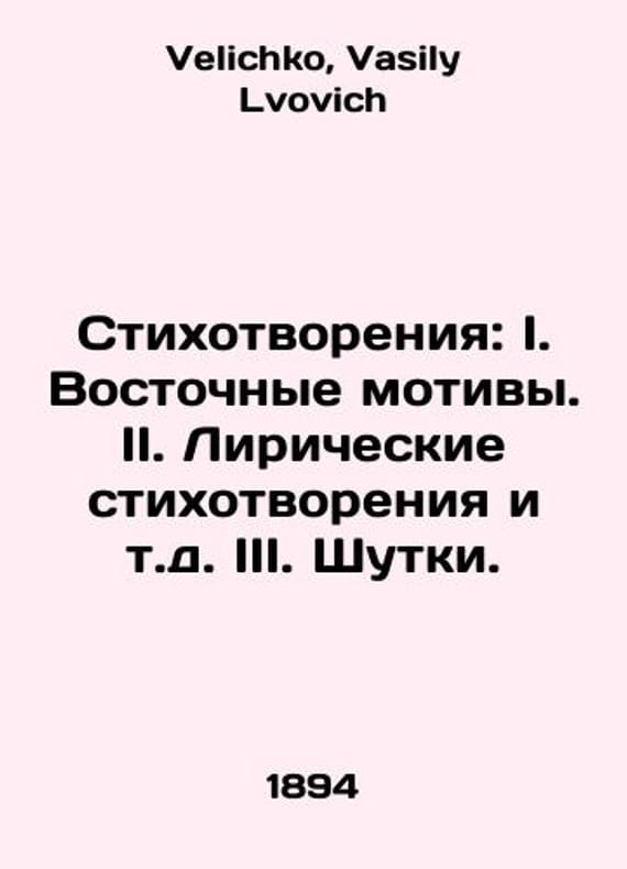 Poems: I. Oriental Motifs. II. Lyrical Poems, etc. III. Jokes. In Russian /Stikhotvoreniya: I. Vostochnye motivy. II. Liricheskie stikhotvoreniya i t.d. III. Shutki. Second Edition. St. Petersburg: 1894, 2, VI, 273 p., (19.5 sm.). We have thousands of titles and often several copies of each title may be available. Please feel free to contact us for a detailed description of the copies available. SKUalb1b09077bcba265e6.