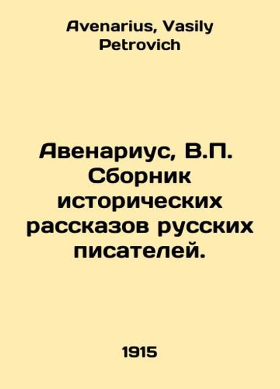 Avenarius, V.P. A collection of historical stories by Russian writers. In Russian /Avenarius, V.P. Sbornik istoricheskikh rasskazov russkikh pisateley. He is the author of fascinating novels and entertaining short stories about the most mysterious events in Russian history. V.Avenariuss novel vividly recreates images of a resurgent Russia from the time of Peter I, when St. Petersburg was founded. The protagonist, Luka Kalmykov, epitomizes the new Russia. He has absorbed the best of Europe and wishes his native Fatherland well. We have thousands of titles and often several copies of each title may be available. Please feel free to contact us for a detailed description of the copies available. SKUalb1c469dd20d6e7453.