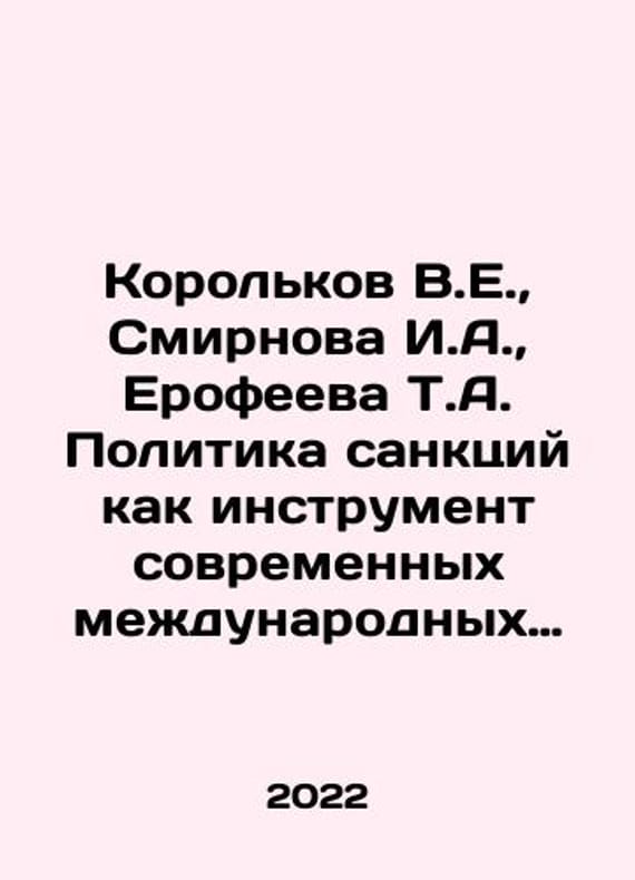 Korolkov V.E., Smirnova I.A., Erofeeva T.A. The policy of sanctions as an instrument of contemporary international relations: Monograph. In Russian /Korolkov V.E., Smirnova I.A., Erofeeva T.A. Politika sanktsiy kak instrument sovremennykh mezhdunarodnykh otnosheniy: Monografiya. Moscow Prometheus 2022. 302 p.We have thousands of titles and often several copies of each title may be available. Please feel free to contact us for a detailed description of the copies available.SKUalb1d1aaf8ce355e4ee.