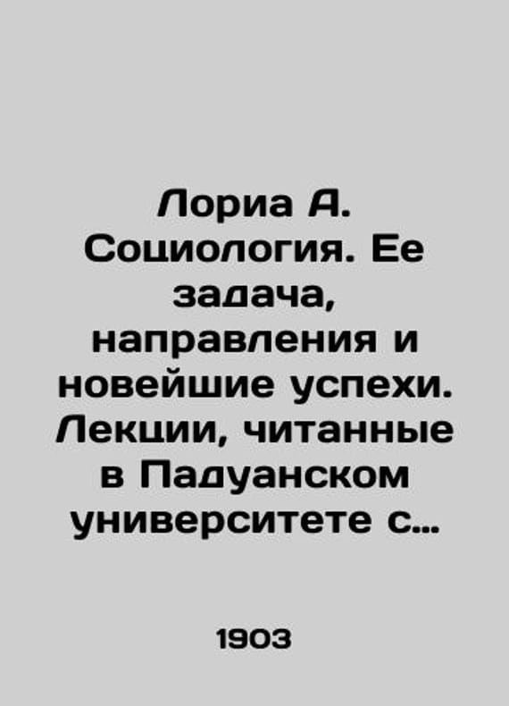 Loria A. Sociology. Its task, directions and latest achievements. Lectures given at the University of Padua from January to May 1900. In Russian /Loria A. Sotsiologiya. Ee zadacha, napravleniya i noveyshie uspekhi. Lektsii, chitannye v Paduanskom universitete s yanvarya po may 1900 goda. Translated from German, edited by Yu.D. Filipova. St. Petersburg. Edition T-va Public Utility. 1903. IV, 120 p.We have thousands of titles and often several copies of each title may be available. Please feel free to contact us for a detailed description of the copies available.SKUalb1d6e2e9a50bf6499.