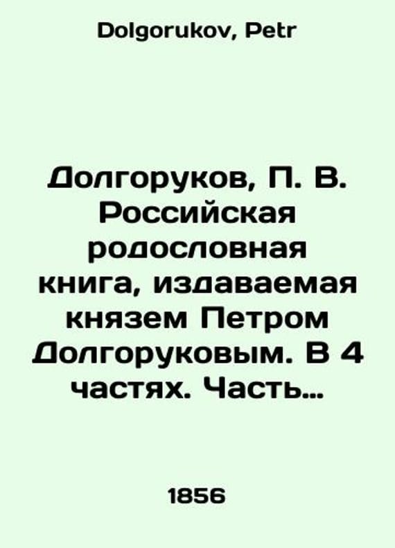 Dolgorukov, P. V. Russian Pedigree Book, published by Prince Peter Dolgorukov. In 4 Parts. Part Three: In Russian /Dolgorukov, P. V. Rossiyskaya rodoslovnaya kniga, izdavaemaya knyazem Petrom Dolgorukovym. V 4 chastyakh. Chast tretya: Princely, Count, Baron surnames, foreign honorary titles and untitled branches of these surnames. St. Petersburg: Printed in the printing house of Edward Weimar. 1856, 523 p., (24.0x15.0 sm.). We have thousands of titles and often several copies of each title may be available. Please feel free to contact us for a detailed description of the copies available. SKUalb1ec8480872919406.