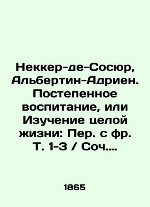 Necker-de-Sausur, Albertin-Adrien. Gradual upbringing or lifelong learning: Translated from Vol. 1-3 / Soc. Mrs. Necker-de-Saussur. In Russian /Nekker-de-Sosyur, Albertin-Adrien. Postepennoe vospitanie, ili Izuchenie tseloy zhizni: Per. s fr. T. 1-3 / Soch. g-zhi Nekker-de-Sossyur. Moscow type. V. Gaultier 1865. 365, V p. We have thousands of titles and often several copies of each title may be available. Please feel free to contact us for a detailed description of the copies available. SKUalb1f12d82aa0792776.