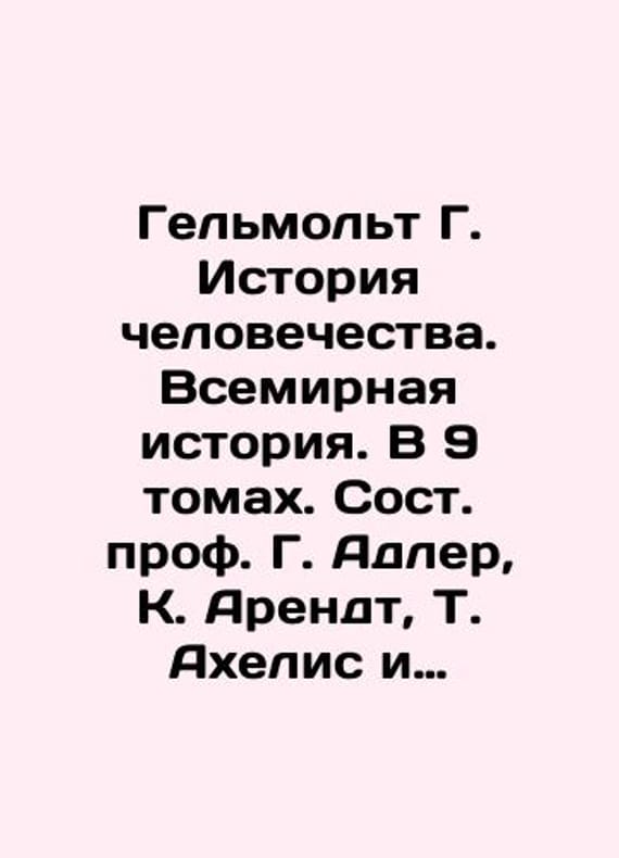 Helmolt G. History of Mankind. World History. In 9 volumes written by Prof. G. Adler, K. Arendt, T. Achelis, et al., Edited by G. Helmolt. Complete translation with significant additions for Russia of selected Russian scientists. In Russian /Gelmolt G. Istoriya chelovechestva. Vsemirnaya istoriya. V 9 tomakh.Sost. prof. G. Adler, K. Arendt, T. Akhelis i dr., Pod obshch. red. G. Gelmolta. Polnyy perevod so znachitelnymi dopolneniyami dlya Rossii izbrannykh russkikh uchenykh. Volume I is devoted to America and the Pacific. Volume II is about Oceania, East Asia and the Indian Ocean. Volume III is about West Asia and Africa. Volume IV is about the peoples of the Mediterranean Sea. Volume V is about Southeast Europe and Slavery. Volume VI is about the Germanic and Roman peoples. Volume VII is about Western Europe until 1800. Volume VIII is about Western Europe in the nineteenth century and the Atlantic Ocean. We have thousands of titles and often several copies of each title may be available. Please feel free to contact us for a detailed description of the copies available. SKUalb20b0eb9966243033.
