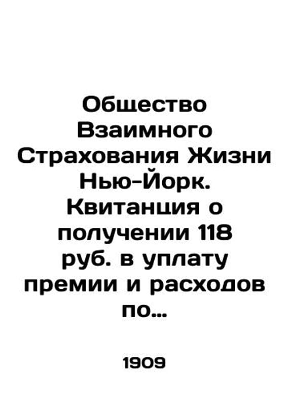 New York Mutual Life Insurance Company. Receipt for 118 roubles in premium and policy costs. and Receipt from Kadeev Post and Telegraph Office for money transfer. In Russian /Obshchestvo Vzaimnogo Strakhovaniya Zhizni Nyu-York. Kvitantsiya o poluchenii 118 rub. v uplatu premii i raskhodov po polisu. and Kvitantsiya Kadievskoy Pochtovo-telegrafnoy Kontory o perevode deneg. In the name of Boris Nikolaevich Sokolov. St. Petersburg and Kadievka 1909. 20.5x23, 5 sm. We have thousands of titles and often several copies of each title may be available. Please feel free to contact us for a detailed description of the copies available. SKUalb20bbe6cc82d7f537.