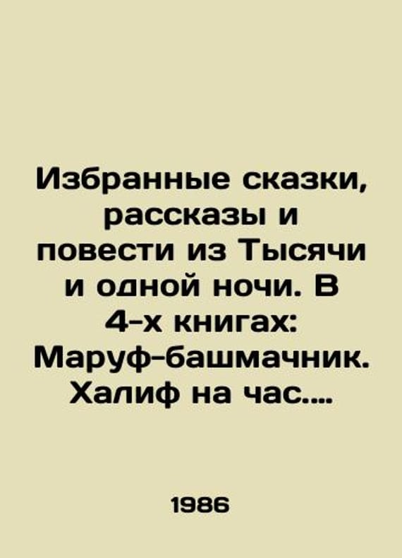 Selected Tales, Stories, and Stories from A Thousand and One Nights. In 4 books: Maruf the Shoemaker. Khalif for an hour. Sinbad the Sailor. Qamar al-Zaman and Queen Budur. In Russian /Izbrannye skazki, rasskazy i povesti iz Tysyachi i odnoy nochi. V 4-kh knigakh: Maruf-bashmachnik. Khalif na chas. Sindbad-morekhod. Tsarevich Kamar az-Zaman i tsarevna Budur. Peter Filshtinsky I. S.Pb.Ushin N. M. Pravda 1986.We have thousands of titles and often several copies of each title may be available. Please feel free to contact us for a detailed description of the copies available. SKUalb211158376e67bde9.