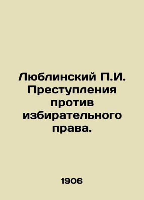 Lublinsky P.I. Crimes against the right to vote. In Russian (ask us if in doubt)/Lyublinskiy P.I. Prestupleniya protiv izbiratel'nogo prava. Short description: In Russian (ask us if in doubt).1906 Pavel Isaakovich Lublinsky (1882-1938) is a well-known lawyer criminologist doctor of legal sciences professor. In 1907 he defended his master's thesis Personal freedom in criminal proceedings. On January 1 1908 P.I. Lublinsky was confirmed as a private associate professor at the Department of Criminal Law and Judicial Proceedings. Since 1909 Lublinsky was a professor of criminal justice and criminal procedure at the Higher Bestuzhevsky Courses in St. Petersburg and was an active participant in the international congresses of the Union of Criminologists held from 1905 to 1915 We have thousands of titles and often several copies of each title may be available. Please feel free to contact us for a detailed description of the copies available. SKUalb21e7d75f7454ea10