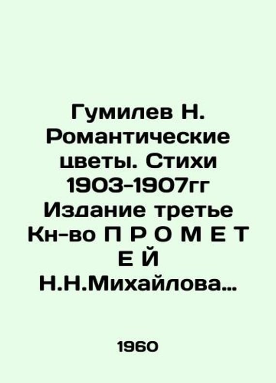 Gumilev N. Romantic Flowers. Poems 1903-1907 Edition 3 of the Book of Poems by Nikolai Mikhailova, St. Petersburg-1918 In Russian /Gumilev N. Romanticheskie tsvety. Stikhi 1903-1907gg Izdanie trete Kn-vo P R O M E T E Y N.N.Mikhaylova S.-Peterburg-1918 Samizdat without output data. Moscow 1960-70-50 p.We have thousands of titles and often several copies of each title may be available. Please feel free to contact us for a detailed description of the copies available.SKUalb2289a2c2f96e99ec.