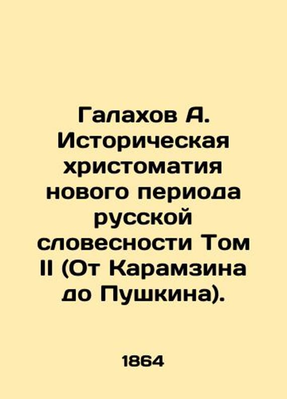 Galakhov A. Historical Christomatics of the New Period of Russian Literature Volume II (From Karamzin to Pushkin). In Russian /Galakhov A. Istoricheskaya khristomatiya novogo perioda russkoy slovesnosti Tom II (Ot Karamzina do Pushkina). St. Petersburg Typogr. Maritime Ministry. 1864. 558 p.We have thousands of titles and often several copies of each title may be available. Please feel free to contact us for a detailed description of the copies available.SKUalb229451c96dc23161.