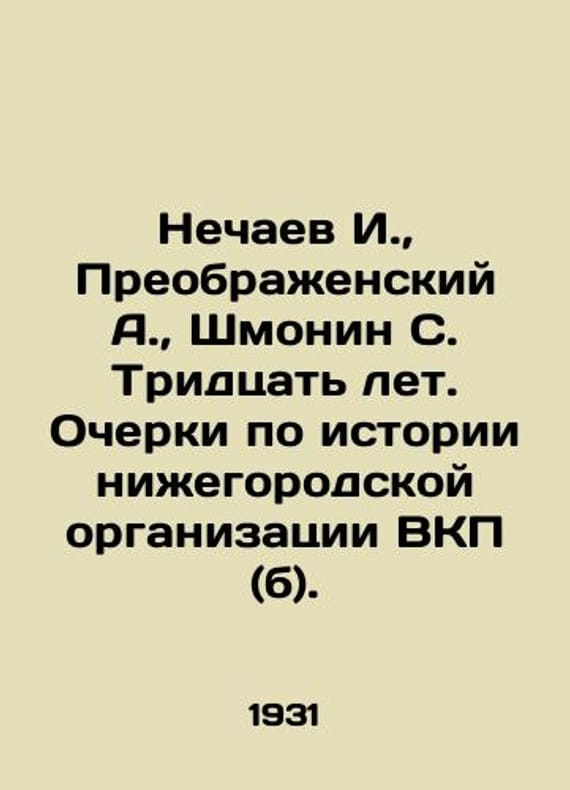 I. Nechaev, A. Preobrazhensky, S. Shmonin Thirty Years. Essays on the History of the Nizhny Novgorod Organization of the All-Union Communist Party (b). In Russian /Nechaev I., Preobrazhenskiy A., Shmonin S. Tridtsat let. Ocherki po istorii nizhegorodskoy organizatsii VKP (b). 1891-1931 Nizhny Novgorod Region Publishing House OGIZ 1931. We have thousands of titles and often several copies of each title may be available. Please feel free to contact us for a detailed description of the copies available. SKUalb234bf89e03df3a56.