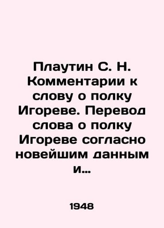 Plautin S. N. Comments on the word about Igors regiment. Translation of the word about Igors regiment according to the latest data and research. In Russian (ask us if in doubt)/Plautin S. N. Kommentarii k slovu o polku Igoreve. Perevod slova o polku Igoreve soglasno noveyshim dannym i issledovaniyam. Paris. Publication of the Historical and Genealogical Society in France. 1948-1950. 33s. We have thousands of titles and often several copies of each title may be available. Please feel free to contact us for a detailed description of the copies available. SKUalb26ef6dd0ff645f06