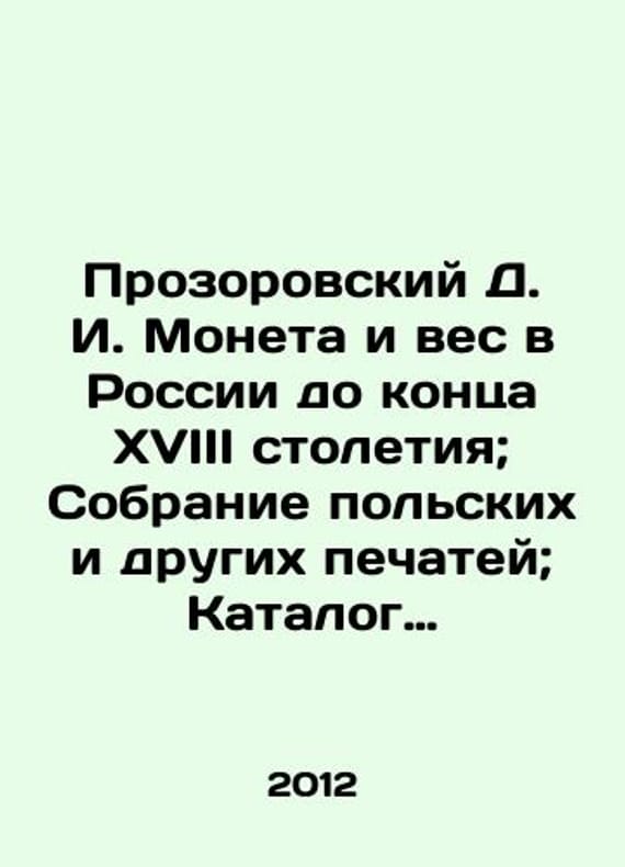 "D. I. Prozorovsky Coin and Weight in Russia until the end of the 18th century; Collection of Polish and other seals; Catalogue of Russian Coins stored in the Museum of the Imperial Archaeological Society In Russian /Prozorovskiy D. I. Moneta i ves v Rossii do kontsa XVIII stoletiya; Sobranie polskikh i drugikh pechatey; Katalog russkim monetam, khranyashchimsya v muzee Imperatorskogo arkheologicheskogo obshchestva Number 10, Moscow Publishing House, V. Sekachev, 2012, 636s. We have thousands of titles and often several copies of each title may be available. Please feel free to contact us for a detailed description of the copies available. SKUalb28b7f3f56d4d0ae8."