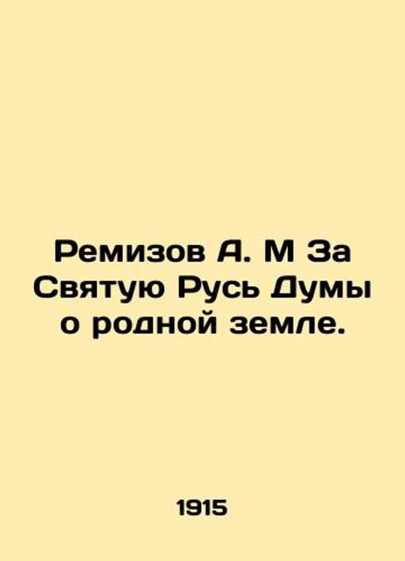 Remizov A. M For the Holy Russia of the Duma on the native land. In Russian (ask us if in doubt)/Remizov A. M Za Svyatuyu Rus Dumy o rodnoy zemle.. Short description: In Russian (ask us if in doubt).The Silver Age. A Life Edition. M. Edition of the journal Fatherland 1915. 62 p. 22 5x15 sm. We have thousands of titles and often several copies of each title may be available. Please feel free to contact us for a detailed description of the copies available. SKUalb29019b23dca1f5c0