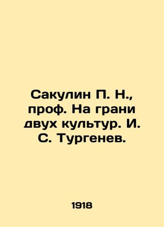Sakulin N., Professor on the Edge of Two Cultures. I. S. Turgenev. In Russian /Sakulin N., prof. Na grani dvukh kultur. I. S. Turgenev. M. Edition of The World. 1918. We have thousands of titles and often several copies of each title may be available. Please feel free to contact us for a detailed description of the copies available. SKUalb2af461323c0cc0ab.