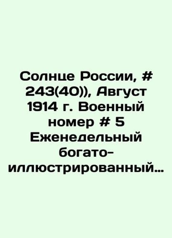 The Sun of Russia, # 243 (40)), August 1914. Military issue # 5 Weekly richly illustrated art-literary magazine. In Russian /Solntse Rossii, # 243(40)), Avgust 1914 g. Voennyy nomer # 5 Ezhenedelnyy bogato-illyustrirovannyy khudozhestvenno-literaturnyy zhurnal. St. Petersburg. St. Petersburg Partnership of Kopeik Publishing Affair, 1914, 16 p., p. We have thousands of titles and often several copies of each title may be available. Please feel free to contact us for a detailed description of the copies available. SKUalb2ed0f52aed3e1249.
