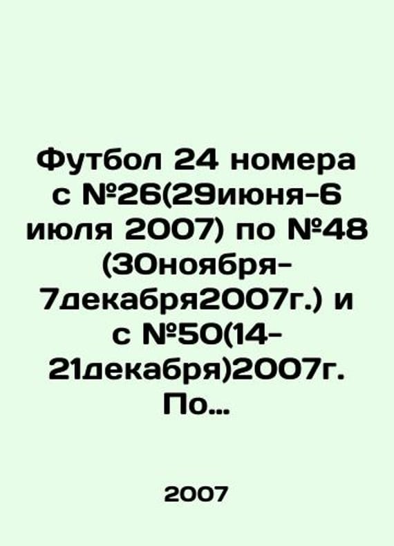 Football 24 numbers from # 26 (June 29-July 6, 2007) to # 48 (November 30-December 7, 2007) and # 50 (December 14-21, 2007) to # 51 (December 21-28, 2007). In Russian /Futbol 24 nomera s #26(29iyunya-6 iyulya 2007) po #48(30noyabrya-7dekabrya2007g.) i s #50(14-21dekabrya)2007g. Po #51(21-28dekabrya)2007g. Weekly M Football Agency 2007. We have thousands of titles and often several copies of each title may be available. Please feel free to contact us for a detailed description of the copies available. SKUalb2f7e29329d177c64.