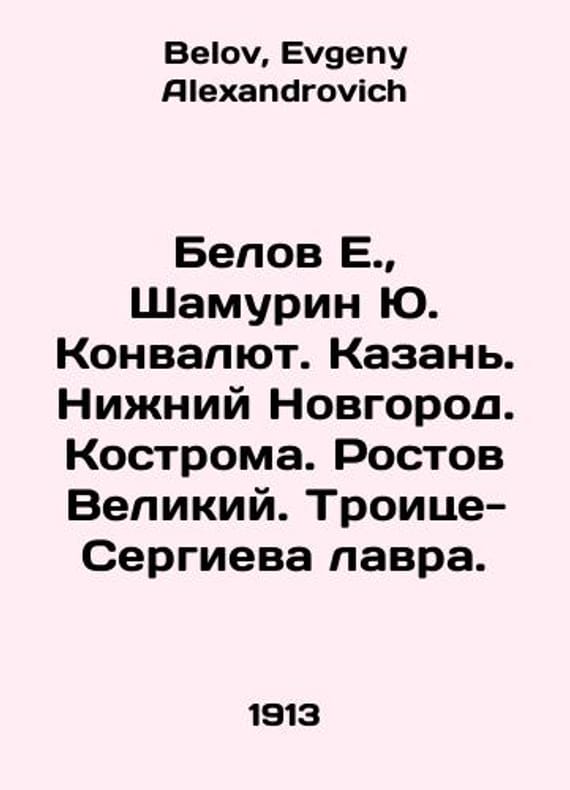 Belov E., Shamurin Yu. Koncurrency. Kazan. Nizhny Novgorod. Kostroma. Rostov the Great. Trinity-Sergiev Lavra. In Russian /Belov E., Shamurin Yu. Konvalyut. Kazan. Nizhniy Novgorod. Kostroma. Rostov Velikiy. Troitse-Sergieva lavra. Cultural Treasures of Russia. Issue 4 and 6. M Edition of Education. 1913. 82 p. We have thousands of titles and often several copies of each title may be available. Please feel free to contact us for a detailed description of the copies available. SKUalb30f01eb35ce457a6.