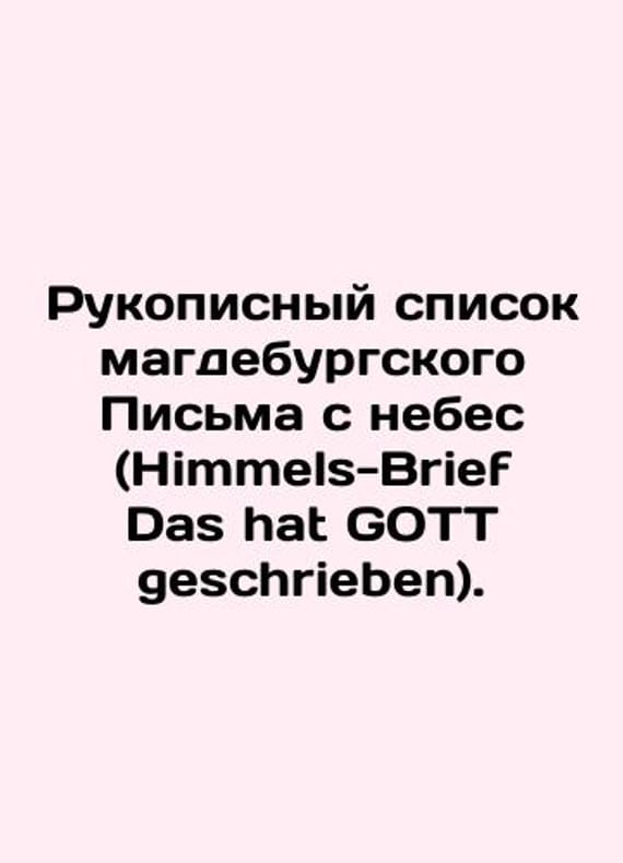 Himmels-Brief Das hat GOTT geschrieben. In Russian (ask us if in doubt)/Rukopisnyy spisok magdeburgskogo Pisma s nebes (Himmels-Brief Das hat GOTT geschrieben). The letter written by God and transmitted through the Angel Michael is a kind of letter of happiness (amulet) supposedly written by Jesus Christ himself. We have thousands of titles and often several copies of each title may be available. Please feel free to contact us for a detailed description of the copies available. SKUalb32bdf0c55c04e270