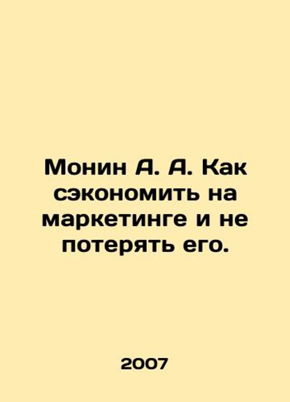 Monin A. A. How to save on marketing and not lose it. In Russian /Monin A. A. Kak sekonomit na marketinge i ne poteryat ego. Series: St. Petersburg Business Owners 2007.We have thousands of titles and often several copies of each title may be available. Please feel free to contact us for a detailed description of the copies available. SKUalb337c9f7258b15bac.