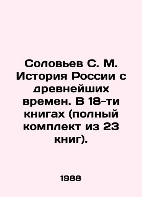 Solovyov S. M. History of Russia since ancient times. In 18 books (complete set of 23 books). In Russian (ask us if in doubt)/Solovev S. M. Istoriya Rossii s drevneyshikh vremen. V 18-ti knigakh (polnyy komplekt iz 23 knig).The present edition is the first multi-volume collection of works by Sergey Solovyov which includes both the complete History of Russia (books 1-15) and his other research important articles and memoirs (books 16-23). The history of Russia since ancient times created by Sergei Mikhailovich Solovyev (1820-1879) is unparalleled in Russian science. We have thousands of titles and often several copies of each title may be available. Please feel free to contact us for a detailed description of the copies available. SKUalb3432c4d28fb761d6