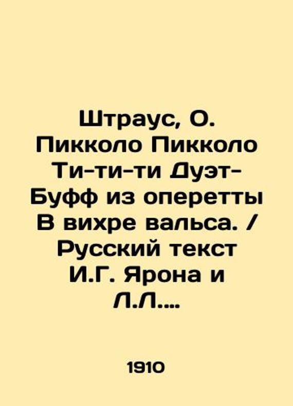 Strauss, Fr. Piccolo Piccolo Ti-ti Duet-Buff from the operetta In the Waltz Vortex. / Russian text by I.G. Yaron and L.L. Palmsky. For one or two voices. In Russian /Shtraus, O. Pikkolo Pikkolo Ti-ti-ti Duet-Buff iz operetty V vikhre valsa. / Russkiy tekst I.G. Yarona i L.L. Palmskogo. Dlya odnogo ili dvukh golosov. St. Petersburg, N.H. Davingof 1910. 1, 5 p.: il., 34p.26,5 sm. We have thousands of titles and often several copies of each title may be available. Please feel free to contact us for a detailed description of the copies available. SKUalb36e21d9a4c1ad325.