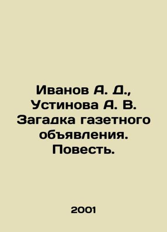Ivanov A. D., Ustinova A. V. The riddle of a newspaper ad In Russian /Ivanov A. D., Ustinova A. V. Zagadka gazetnogo obyavleniya. Povest. Child Detective. Black Kitten series. Development of serial decoration of the artist A. Shcherbakov. Artist A. Pyankov. Moscow. EXMO-Press. 2001. 224 p. We have thousands of titles and often several copies of each title may be available. Please feel free to contact us for a detailed description of the copies available. SKUalb374caa39bac1adb6.