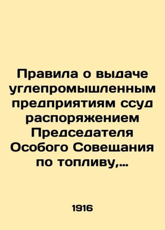 Rules on Loans to Coal Industries by Order of the Chairman of the Special Meeting on Fuel after discussion at the Special Meeting. In Russian (ask us if in doubt)/Pravila o vydache uglepromyshlennym predpriyatiyam ssud rasporyazheniem Predsedatelya Osobogo Soveshchaniya po toplivu po obsuzhdenii v Osobom Soveshchanii.. Short description: In Russian (ask us if in doubt).On the authentic G. by the Minister of Trade and Industry it is written: I approve August 20 1916. Minister of Commerce and Industry K. Shakhovskaya. 1916. 8 p. We have thousands of titles and often several copies of each title may be available. Please feel free to contact us for a detailed description of the copies available. SKUalb376bab4b8eee9664