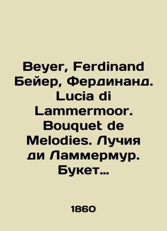 Beyer, Ferdinand Beyer, Ferdinand. Lucia di Lammermoor. Bouquet de Melodies. Lucia di Lammermoor. Bouquet of tunes. Op.42 N1. In Russian /Beyer, Ferdinand Beyer, Ferdinand. Lucia di Lammermoor. Bouquet de Melodies. Luchiya di Lammermur. Buket melodiy. Op.42 N1. St. Petersburg, F. Stellovsky, 1860-1865. We have thousands of titles and often several copies of each title may be available. Please feel free to contact us for a detailed description of the copies available. SKUalb384e602318ae27e4.
