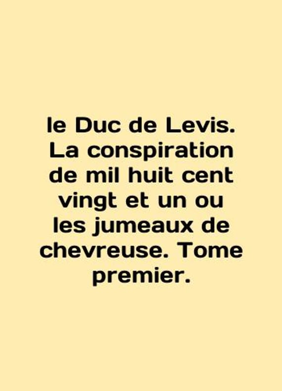 Le Duc de Levis. La conspiracy de mil huit cent vingt et un ou les jumeaux de chevreuse In Russian /le Duc de Levis. La conspiration de mil huit cent vingt et un ou les jumeaux de chevreuse. Tome premier. Le Duc de Levis. La conspiracy de mil huit cent vingt et un ou les jumeaux de chevreuse. We have thousands of titles and often several copies of each title may be available. Please feel free to contact us for a detailed description of the copies available. SKUalb39256dc97c27a1aa.