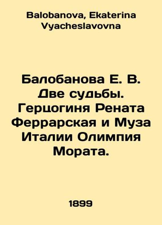 Balobanova E. V. Two Fates. Duchess Renata Ferrara and Muse of Italy Olympia Morata. In Russian /Balobanova E. V. Dve sudby. Gertsoginya Renata Ferrarskaya i Muza Italii Olimpiya Morata. Biography from the Renaissance and Reformation Era. St. Petersburg: 1899. 136 p. We have thousands of titles and often several copies of each title may be available. Please feel free to contact us for a detailed description of the copies available. SKUalb3a02a074ef96c99a.