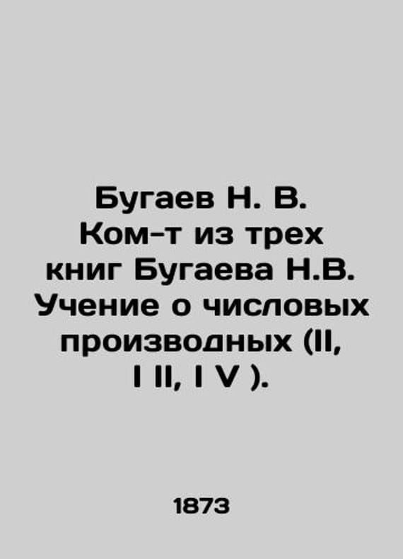 Bugaev N. V. Part of three books by Bugaev N. V. Teaching about numerical derivatives (II I II I V). In Russian (ask us if in doubt)/Bugaev N. V. Kom-t iz trekh knig Bugaeva N.V. Uchenie o chislovykh proizvodnykh (II I II I V ).. II pp. Generalized Numerical Series. Numerical Derivatives in Relation to Numerical Identity. Circulation of Numerical Series. I Part II. Analytical and Numerical Appendices of Teaching about Numerical Derivatives. The Problem of First Numbers. I Part V. Decomposition by Function. SKUalb3afb913169ce323a.