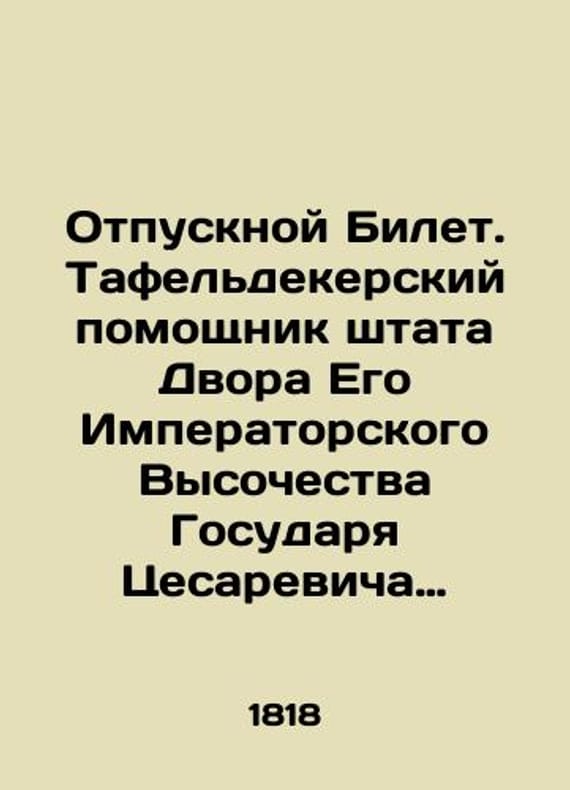 Vacation ticket. Tafeldeker assistant to the staff of the Court of His Imperial Highness Sovereign Caesarevic Grand Duke Konstantin Pavlovich Peter Bertrand. In Russian (ask us if in doubt)/Otpusknoy Bilet. Tafeldekerskiy pomoshchnik shtata Dvora Ego Imperatorskogo Vysochestva Gosudarya Tsesarevicha Velikogo Knyazya Konstantina Pavlovicha Petr Bertran. Sacked on vacation to Borovichi. for ten days. St. Petersburg 1818. 17x20 sm. We have thousands of titles and often several copies of each title may be available. Please feel free to contact us for a detailed description of the copies available. SKUalb3c4b27c377fe2e3e