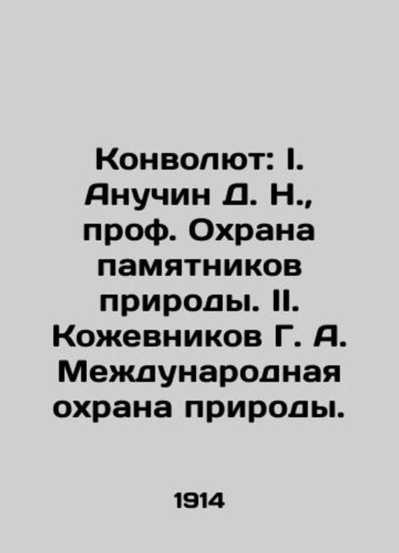 Convolutee: I. Anuchin D. N., Professor of Nature Monuments Protection. II. Kozhevnikov G. A. International Nature Protection. In Russian /Konvolyut: I. Anuchin D. N., prof. Okhrana pamyatnikov prirody. II. Kozhevnikov G. A. Mezhdunarodnaya okhrana prirody. M. Typo-lithography t-v I. N. Kushnerev and Co. 1914. 59s. We have thousands of titles and often several copies of each title may be available. Please feel free to contact us for a detailed description of the copies available. SKUalb3f14689ff631a033.