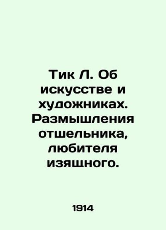 Tik L. On Art and Artists. Reflections of the Hermit the Lover of the Graceful. In Russian (ask us if in doubt)/Tik L. Ob iskusstve i khudozhnikakh. Razmyshleniya otshelnika lyubitelya izyashchnogo.. Translation from German. M Nekrasov Book Publishing House 1914. IV 307 XIII p. A treatise on the art of the German romantic writer W.Wackenroder supplemented by L.Tickenroder. Fax reproduction of the 1826 edition. SKUalb41ec9a60408a8395.