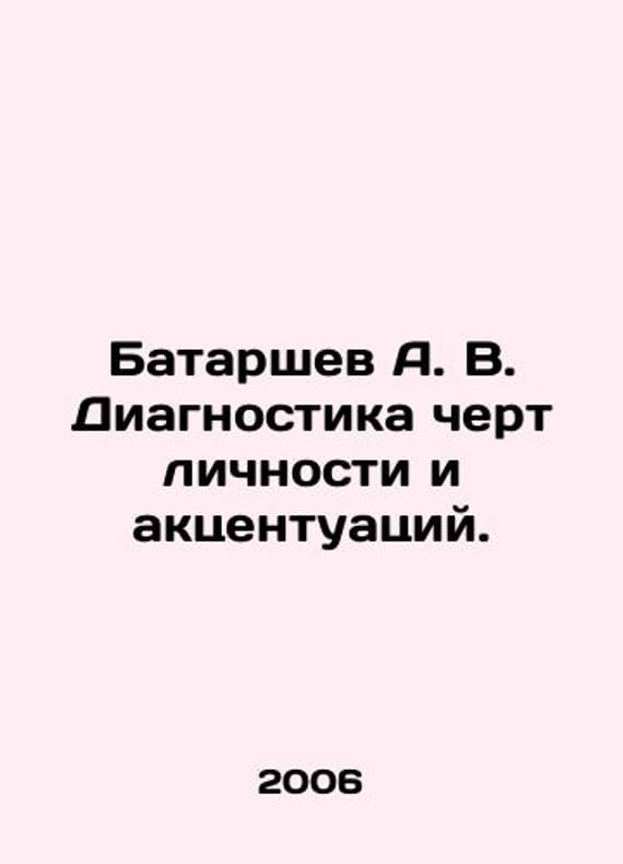 Batarshev A. V. Diagnosis of personality traits and accents. In Russian /Batarshev A. V. Diagnostika chert lichnosti i aktsentuatsiy. Practical Guide. Series: Textbooks. Moscow, Publishing House of Psychotherapy, 2006, 288 p. We have thousands of titles and often several copies of each title may be available. Please feel free to contact us for a detailed description of the copies available. SKUalb43407dd8b067ae7f.
