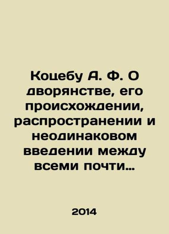 Kotsebu A.F. On the nobility, its origin, spread, and unequal introduction among almost all the peoples of the world, with a brief mention of its extermination in France and other dependent countries. In Russian /Kotsebu A. F. O dvoryanstve, ego proiskhozhdenii, rasprostranenii i neodinakovom vvedenii mezhdu vsemi pochti narodami zemnogo shara, s kratkim upominaniem ego istrebleniya vo Frantsii i drugikh ot nee zavisyashchikh stranakh. Model 5 Moscow Publishing House, V. Sekachev, 2014, 268p. We have thousands of titles and often several copies of each title may be available. Please feel free to contact us for a detailed description of the copies available. SKUalb438ab90cfbec5a91.