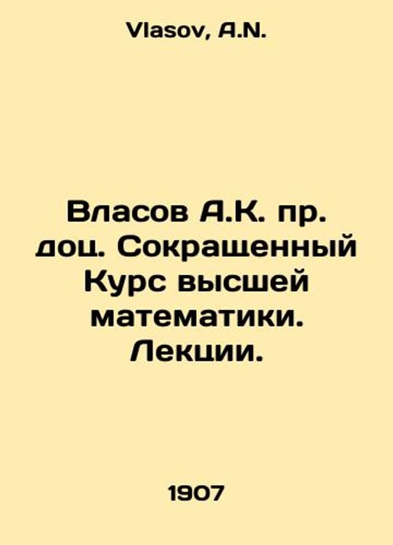 Vlasov A.K., Ph.D., Abbreviated Course of Higher Mathematics. Lectures. In Russian /Vlasov A.K. pr. dots. Sokrashchennyy Kurs vysshey matematiki. Lektsii. M. 1907-1908. 544s. We have thousands of titles and often several copies of each title may be available. Please feel free to contact us for a detailed description of the copies available. SKUalb43d83e5fabdc92df.