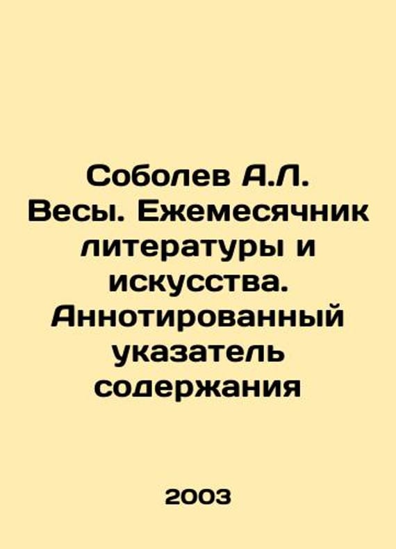 Sobolev A.L. Scales. Monthly of Literature and Art. Annotated index of content In Russian (ask us if in doubt)/Sobolev A.L. Vesy. Ezhemesyachnik literatury i iskusstva. Annotirovannyy ukazatel' soderzhaniya. Short description: In Russian (ask us if in doubt).M. Truten 2003. 384 p. We have thousands of titles and often several copies of each title may be available. Please feel free to contact us for a detailed description of the copies available. SKUalb44abd0ae964ec440