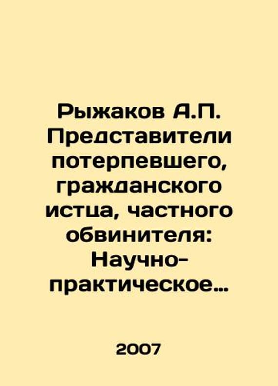 Ryzhakov A.P. Representatives of the victim, the civil plaintiff, the private prosecutor: Scientific and practical guidance. In Russian /Ryzhakov A.P. Predstaviteli poterpevshego, grazhdanskogo isttsa, chastnogo obvinitelya: Nauchno-prakticheskoe rukovodstvo. M 2007 Exam 319 pp. We have thousands of titles and often several copies of each title may be available. Please feel free to contact us for a detailed description of the copies available. SKUalb455b6fb9ccffaf45.