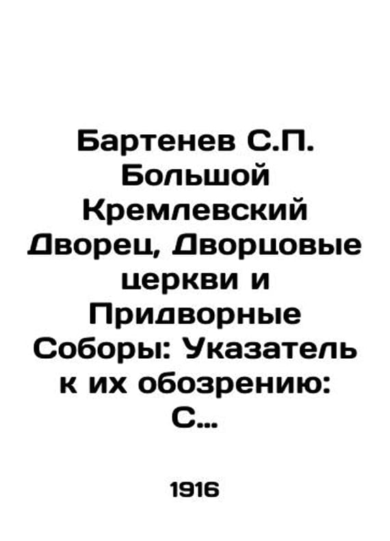 Bartenev S.P. Grand Kremlin Palace, Palace Churches and Court Cathedrals: Index to their Review: With 97 drawings in the text. In Russian /Bartenev S.P. Bolshoy Kremlevskiy Dvorets, Dvortsovye tserkvi i Pridvornye Sobory: Ukazatel k ikh obozreniyu: S 97 risunkami v tekste. The third edition, amended and supplemented, was compiled by S. P. Bartenev on behalf of the Head of the Court Unit in Moscow and Head of the Moscow Palace Department of the Adjutant General Prince Odoevsky-Maslov. We have thousands of titles and often several copies of each title may be available. Please feel free to contact us for a detailed description of the copies available. SKUalb46516c8faaac81c2.