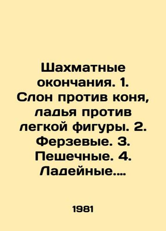Chess endings. 1. Elephant versus horse, rook versus easy figure. 2. Ferzevye. 3. Pedestrians. 4. Ladeiye. 5. Elephant endgame. 6. Endgame contours. 7 The theory of Ladyendgame endgame. 8. Endgame strategy. 8 books. In Russian /Shakhmatnye okonchaniya. 1. Slon protiv konya, ladya protiv legkoy figury. 2. Ferzevye. 3. Peshechnye. 4. Ladeynye. 5. Slonovye. Konevye. 6. Kontury endshpilya. 7 Teoriya ladeynykh okonchaniy. 8. Strategiya endshpilya. 8 knig. Under the editorship of Yu. L. Averbach. M. FiS. 1981-84. 288 p. We have thousands of titles and often several copies of each title may be available. Please feel free to contact us for a detailed description of the copies available. SKUalb477f985ed472bb0b.