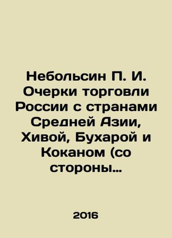 Nebolsin P. I. Essays on Russias Trade with Central Asian Countries, Khiva, Bukhara, and Kokan (from the Orenburg Line). In Russian /Nebolsin P. I. Ocherki torgovli Rossii s stranami Sredney Azii, Khivoy, Bukharoy i Kokanom (so storony Orenburgskoy linii). 5 copy Moscow Publishing House, V. Sekachev, 2016, 376s. We have thousands of titles and often several copies of each title may be available. Please feel free to contact us for a detailed description of the copies available. SKUalb48537a402860804d.