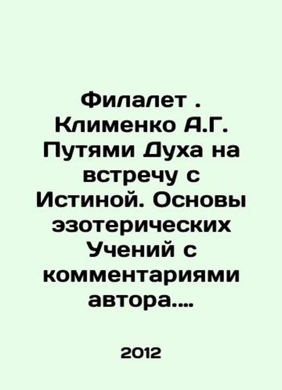 Filalet. Klimenko A.G. Ways of the Spirit to meet the Truth. Basics of esoteric teachings with comments by the author. A novel-essay. In Russian /Filalet. Klimenko A.G. Putyami Dukha na vstrechu s Istinoy. Osnovy ezotericheskikh Ucheniy s kommentariyami avtora. Roman-esse. M. 2012. 400 p. We have thousands of titles and often several copies of each title may be available. Please feel free to contact us for a detailed description of the copies available. SKUalb490bad8c231b0ddd.