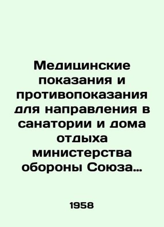 Medical indications and contraindications for referral to sanatoriums and rest homes of the Ministry of Defence of the USSR. In Russian /Meditsinskie pokazaniya i protivopokazaniya dlya napravleniya v sanatorii i doma otdykha ministerstva oborony Soyuza SSR. M. Voenizdat 1958. 244s. We have thousands of titles and often several copies of each title may be available. Please feel free to contact us for a detailed description of the copies available. SKUalb49476f64e31181dd.