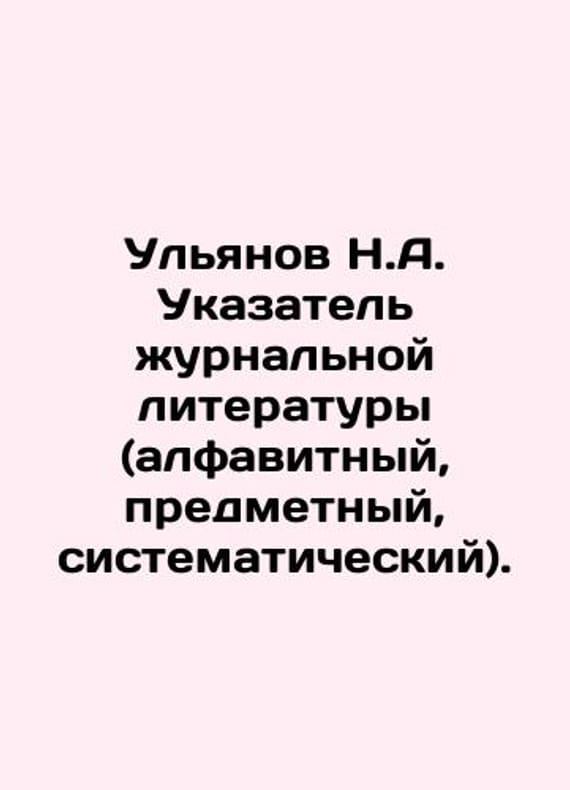 Ulyanov N.A. Index of journal literature (alphabetical subject systematic). In Russian (ask us if in doubt)/Ulyanov N.A. Ukazatel zhurnalnoy literatury (alfavitnyy predmetnyy sistematicheskiy).N.A.Ulyanov). Volume II (compiled by N.A.Ulyanov and V.N.Ulyanova) We have thousands of titles and often several copies of each title may be available. Please feel free to contact us for a detailed description of the copies available. SKUalb49f661749439b708