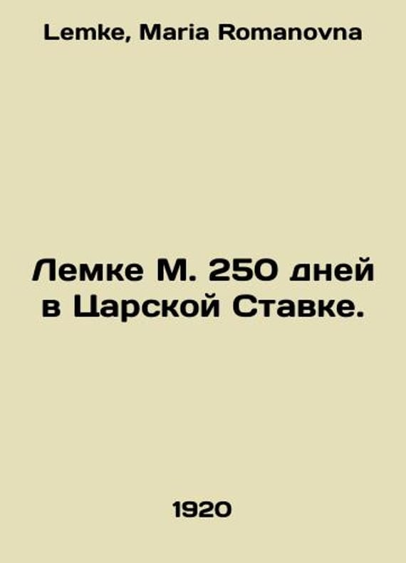 Lemke M. 250 days at the Tsars Rate. In Russian /Lemke M. 250 dney v Tsarskoy Stavke. Pg. GIZ 1920. XVIII and 859 pp. We have thousands of titles and often several copies of each title may be available. Please feel free to contact us for a detailed description of the copies available. SKUalb4a8c24f5997f06ef.