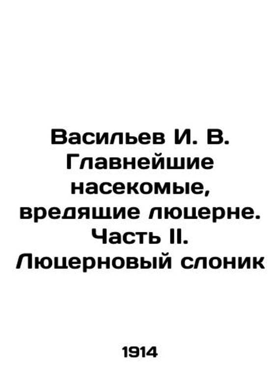 Vasiliev I. V. The main insects that harm alfalfa. Part II. The alfalfa elephant In Russian /Vasilev I. V. Glavneyshie nasekomye, vredyashchie lyutserne. Chast II. Lyutsernovyy slonik its description, way of life and measures to combat it. Agricultural monograph. With 15 figures. Edition 2, supplemented by the Proceedings of the entomology bureau of T. VIII. # 2. Petrograd. Printing by M. Merkushev. 1914. 44 p. We have thousands of titles and often several copies of each title may be available. Please feel free to contact us for a detailed description of the copies available. SKUalb4b7d4a2083fb98c1.