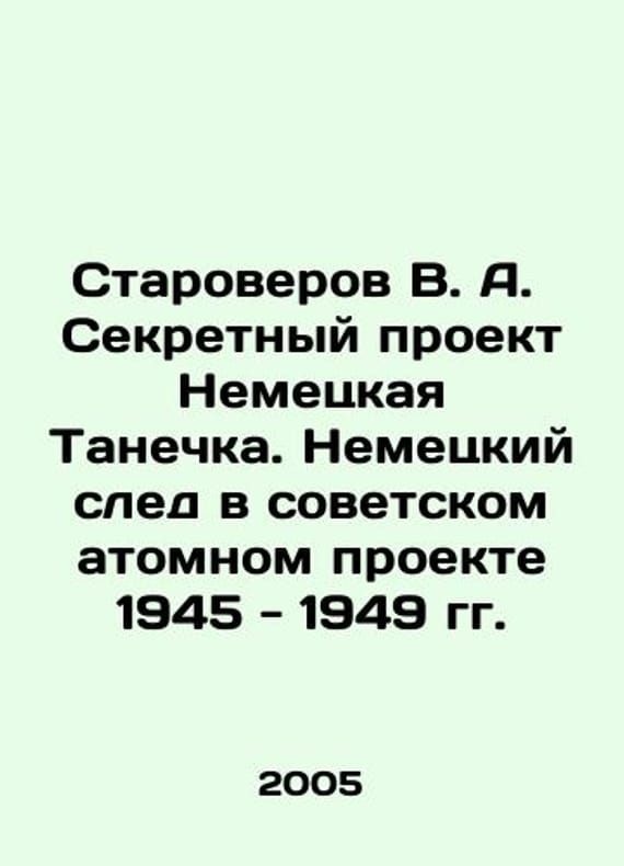 Staroverov V.A. The Secret Project German Tanechka. The German Trace in the Soviet Atomic Project 1945-1949 In Russian /Staroverov V. A. Sekretnyy proekt Nemetskaya Tanechka.Nemetskiy sled v sovetskom atomnom proekte 1945 - 1949 gg. Series: From Secret and Personal Archives. Dedicated to the secret service workers who ensured the success of the Soviet atomic weapons. Moscow Publishing House Rus, Society for the Study of the History of the National Security Services. 2005. We have thousands of titles and often several copies of each title may be available. Please feel free to contact us for a detailed description of the copies available. SKUalb4c546255db9b76fe.